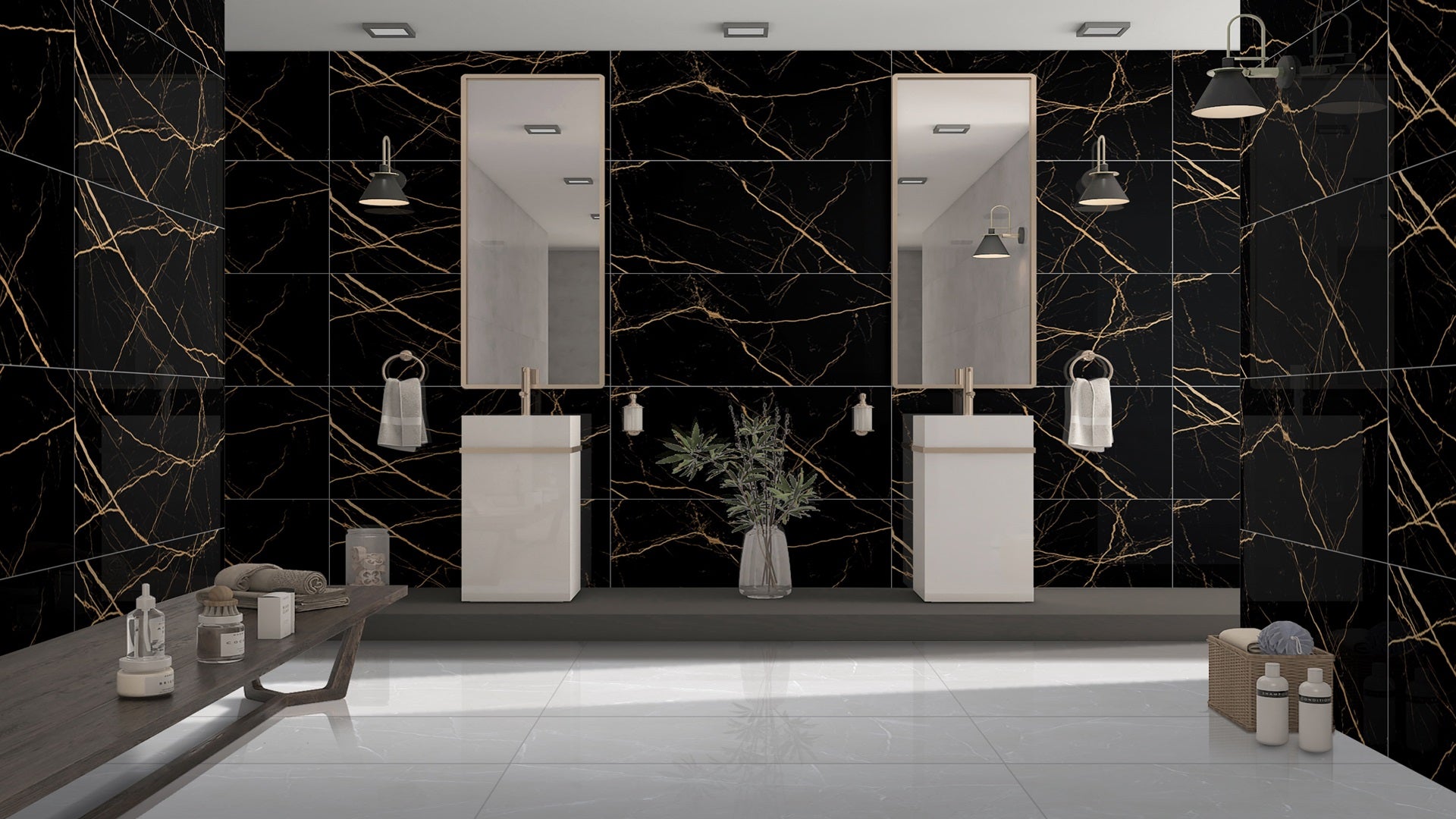 Elevate your space with the Atlantis Gold Polished Porcelain Tile — a masterpiece of luxury and sophistication. Its deep black surface, adorned with striking gold veining, creates a bold, opulent statement reminiscent of natural marble.